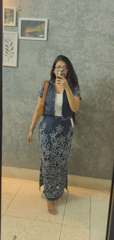 Crafted from 100% pure premium denim, this three-piece set features a short embroidered denim shirt, a white inner top, and a high-waisted skirt detailed with delicate floral embroidered cutwork. The soft embroidery adds a refined contrast to structured denim, creating a look that feels both fresh and feminine.